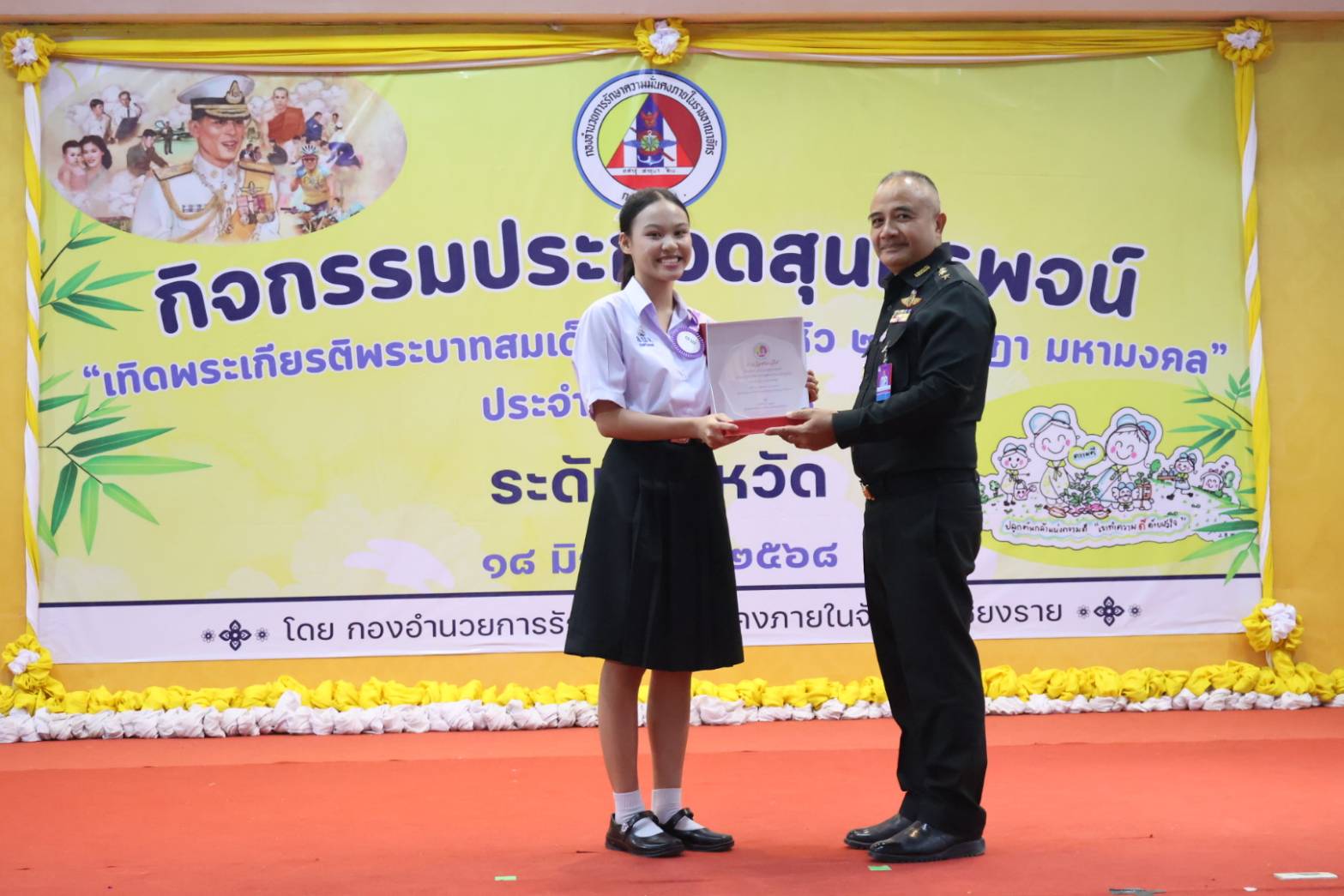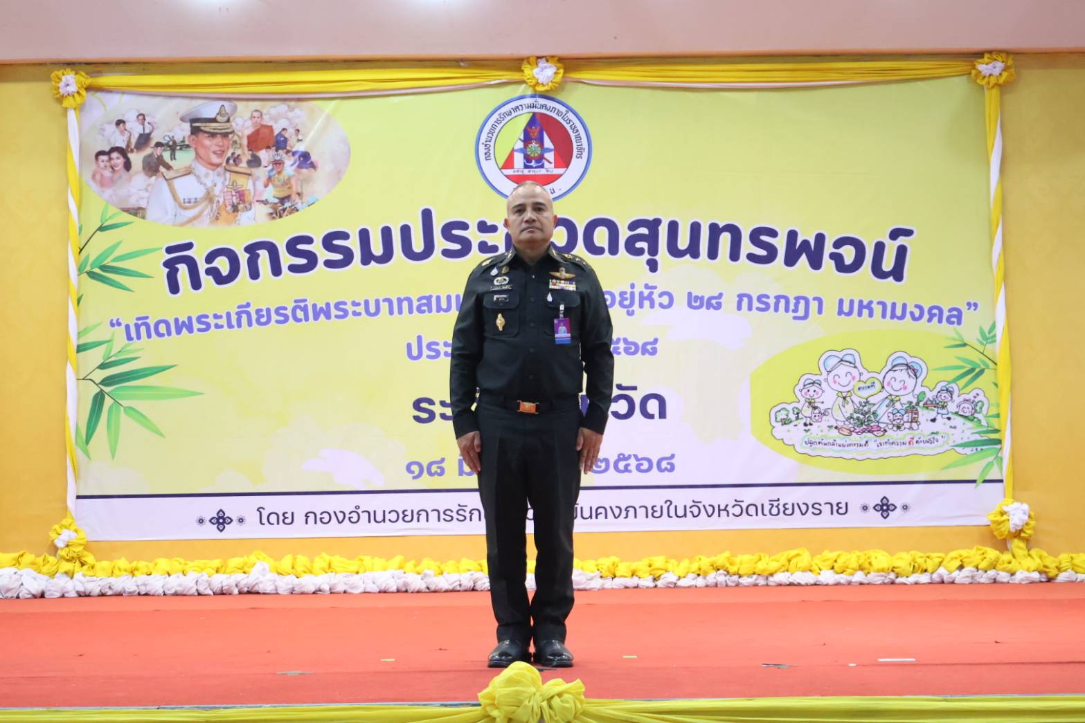 วันที่ 18 มิถุนายน 2568 ที่ หอประชุมคชสาร องค์การบริหารส่วนจังหวัดเชียงราย อ.เมืองเชียงราย พ.อ. ภาณุมาส จีนานุรักษ์ รองผู้อำนวยการรักษาความมั่นคงภายในจังหวัดเชียงราย เป็นประธานในการจัดกิจกรรมประกวดสุนทรพจน์ “เทิดพระเกียรติพระบาทสมเด็จพระเจ้าอยู่หัว 28 กรกฎาคม มหามงคล” ระดับจังหวัด ประจำปีงบประมาณ พ.ศ 2568 โดยมีนักเรียนเข้าร่วมประกวด 33 คน และคณะครู จากโรงเรียนต่างๆ ในจังหวัดเชียงราย เข้าร่วมการจัดกิจกรรมประกวดสุนทรพจน์ “เทิดพระเกียรติพระบาทสมเด็จพระเจ้าอยู่หัว 28 กรกฎาคม มหามงคล”