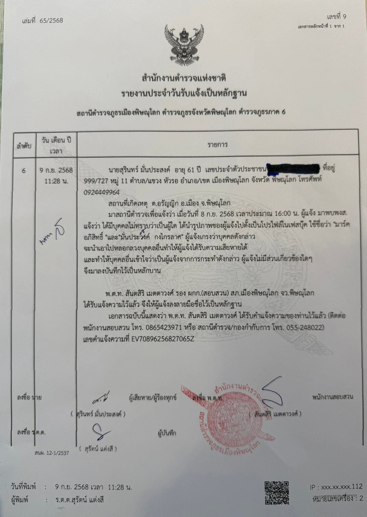 เข้าแจ้งความต่อ พ.ต.ท.สันตสิริ เมตตาวงศ์ พนักงานสอบสวน สภ.เมืองพิษณุโลกว่า เมื่อวันที่ 8 ก.ย. 2568 เวลาประมาณ 16.00 น. ได้มีบุคคลไม่ทราบว่าเป็นผู้ใด ได้นำรูปภาพของผู้แจ้งไปตั้งเป็นโปรไฟล์ในเฟซบุ๊ค ใช้ชื่อว่า “มาร์ค อภิสิทธิ์ “และ”มั่นประสงค์ กงไกรลาศ” ผู้แจ้งเกรงว่าบุคคลดังกล่าว จะนำเอาไปหลอกลวงบุคคลอื่นทำให้ผู้แจ้งได้รับความเสียหายได้ และทำให้บุคคลอื่นเข้าใจว่าเป็นผู้แจ้งจากการกระทำดังกล่าว ผู้แจ้งไม่มีส่วนเกี่ยวข้องใดๆ จึงมาลงบันทึกไว้เป็นหลักฐาน พ.ต.ท. สันตสิริ เมตตาวงศ์ รอง ผกก.(สอบสวน) สภ.เมืองพิษณุโลก จ.พิษณุโลก ได้รับแจ้งความไว้แล้ว จึงให้ผู้แจ้งลงลายมือชื่อไว้เป็นหลักฐาน