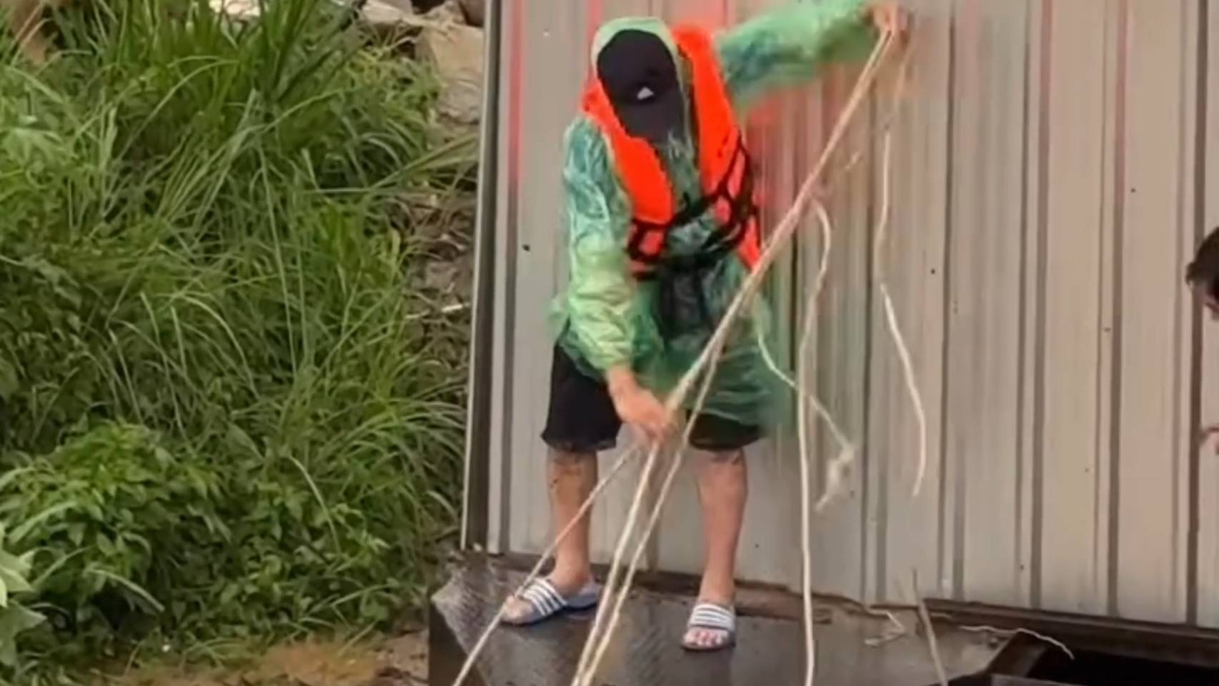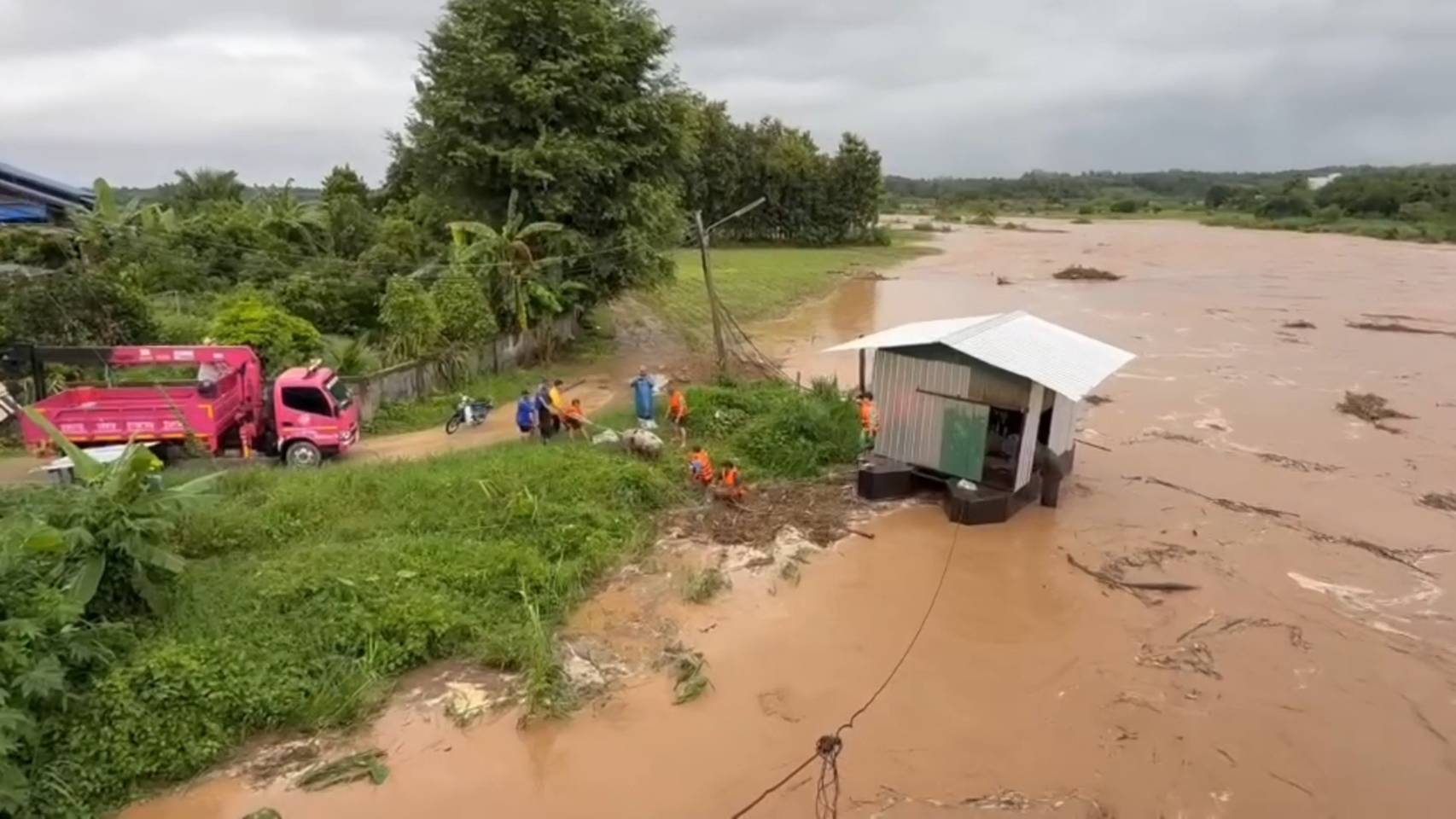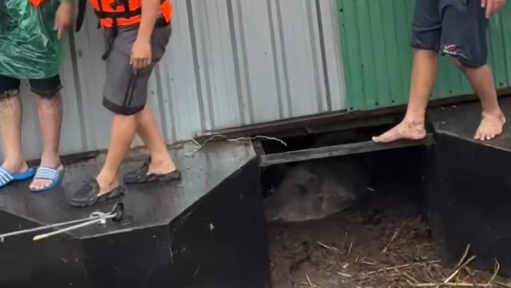 ทันทีที่มีผู้พบเห็น ได้รีบแจ้งชาวบ้านและเจ้าหน้าที่ให้เข้าช่วยเหลือ โดยการช่วยเหลือเป็นไปอย่างยากลำบาก เนื่องจากกระแสน้ำเชี่ยวแรงและมีเศษไม้ ขอนไม้ รวมถึงซากวัสดุลอยมากับน้ำจำนวนมาก แต่ทุกฝ่ายก็ไม่ย่อท้อ ใช้เชือกและอุปกรณ์ในการดึงตัวหมูออกมาอย่างระมัดระวัง ท่ามกลางชาวบ้านที่เฝ้าติดตามอย่างลุ้นระทึกจนในที่สุดหลังใช้เวลาอยู่นาน ชาวบ้านและเจ้าหน้าที่ก็สามารถช่วยชีวิตหมูตัวดังกล่าวออกมาได้อย่างปลอดภัย ขณะนี้เจ้าหน้าที่ฝ่ายปกครองและองค์กรปกครองส่วนท้องถิ่นยังคงเฝ้าระวังสถานการณ์อย่างใกล้ชิดแม้บางที่น้ำอาจจะลดแล้วเนื่องจากปริมาณฝนยังตกอย่างต่อเนื่อง และมีความเป็นไปได้ที่ระดับน้ำอาจเพิ่มสูงขึ้นอีก