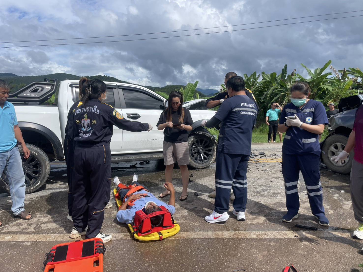 ที่เกิดเหตุพบรถกระบะ อีซูซุ สีดำ ทะเบียน บบ-6062 พย. สภาพด้านหน้าพังยับเยินทั้งคัน และรถกระบะ ฟอร์ด สีขาว ทะเบียน 6ขว-8185 กทม. สภาพด้านหน้าพังเสียหายเช่นกันจากการตรวจสอบพบผู้บาดเจ็บ 2 ราย ได้แก่ชาย อายุ 41 ปี คนขับรถฟอร์ด มีอาการซึมและปวดหน้าอก หญิง อายุ 54 ปี ผู้โดยสารรถอีซูซุ มีบาดแผลฉีกขาดบริเวณศีรษะ และปวดไหล่ซ้าย นอกจากนี้ยังมีผู้เสียชีวิตในที่เกิดเหตุ 1 ราย ทราบชื่อคือ นายชนแก้ว ตามเรือน อายุ 60 ปี คนขับรถอีซูซุ ดีแมคซ์กู้ภัยได้เร่งนำผู้บาดเจ็บส่งรักษาตัวที่โรงพยาบาลเชียงคำ ขณะที่ร่างผู้เสียชีวิตถูกนำส่งเพื่อดำเนินการตามขั้นตอนต่อไป