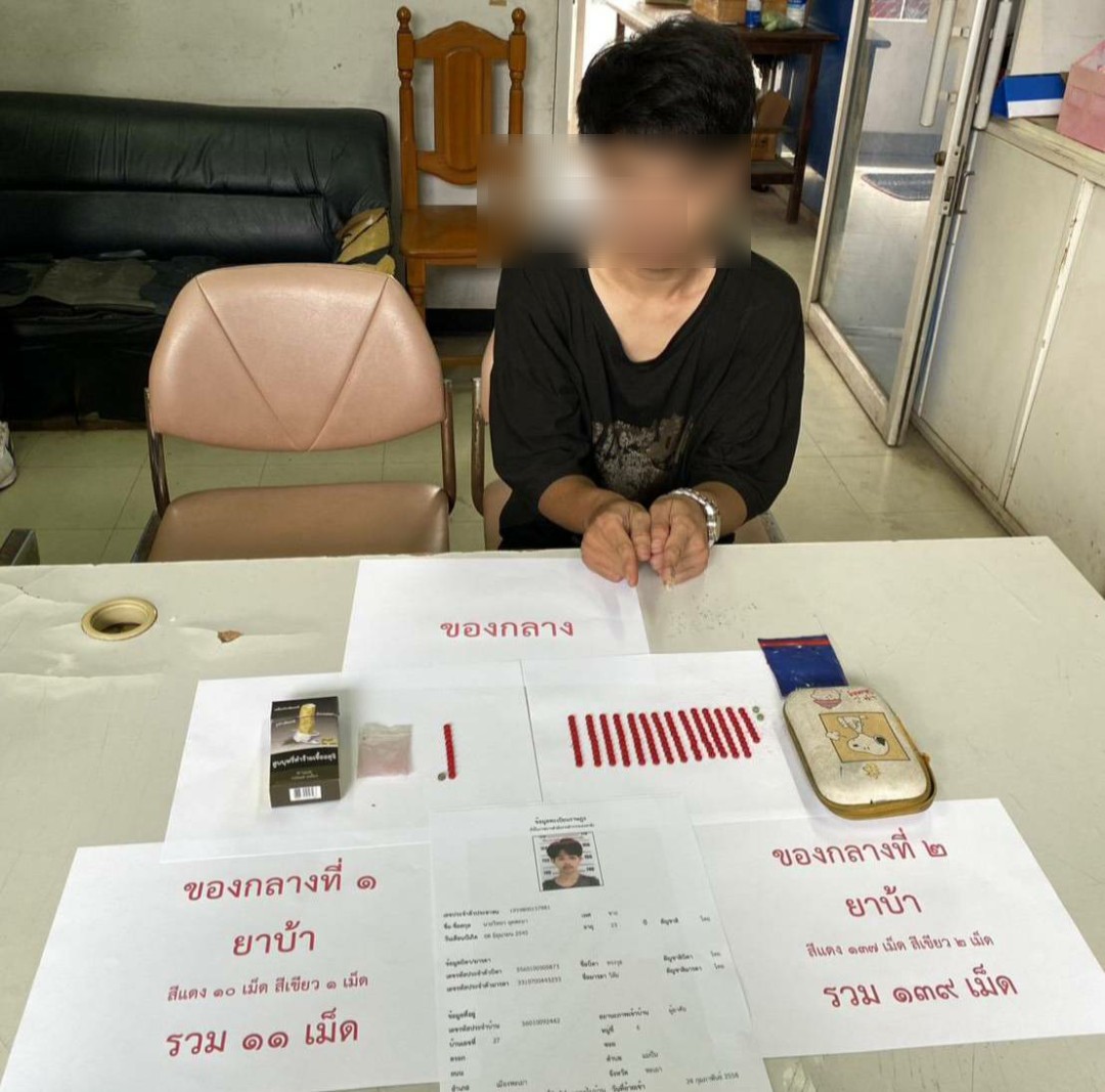 จากการตรวจค้น พบ ยาบ้าเม็ดสีแดงและสีเขียวรวม 11 เม็ด ซุกอยู่ในซองบุหรี่ยี่ห้อ L&M ภายในกำมือข้างขวา ขณะเดียวกัน เจ้าหน้าที่พบว่ามีกระเป๋าเล็กถูกโยนลงมาจากห้องพัก เมื่อตรวจสอบภายในพบ ยาบ้าเพิ่มอีก 139 เม็ด รวมของกลางทั้งหมด 150 เม็ด