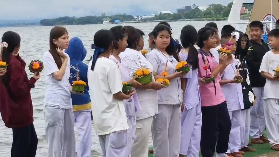 ลอยกระทงกลางกว๊านพะเยา เด็กนักเรียนแต่งชุดขาวสืบสาน ยี่เป็งล้านนาอย่างงดงาม