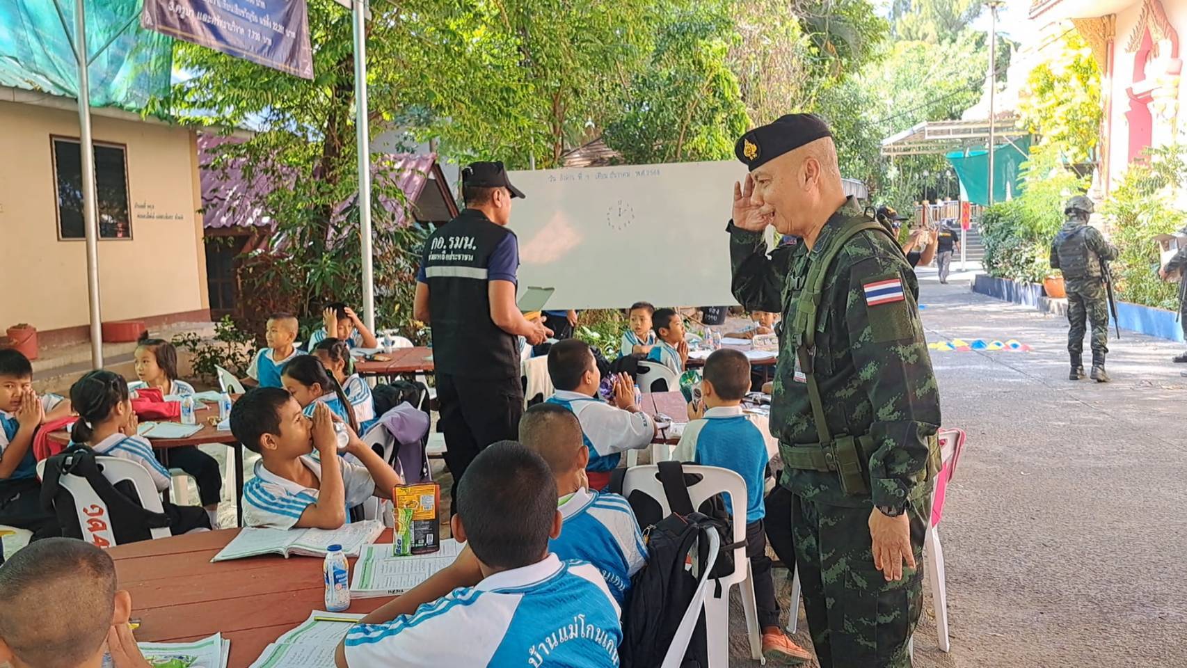 ผบ.กกล.นเรศวร ลงพื้นที่บ้านแม่โกนเกน เยี่ยมนักเรียนและครู หลังใช้วัดและศาลาประชาคมหมู่บ้าน เรียนชั่วคราว