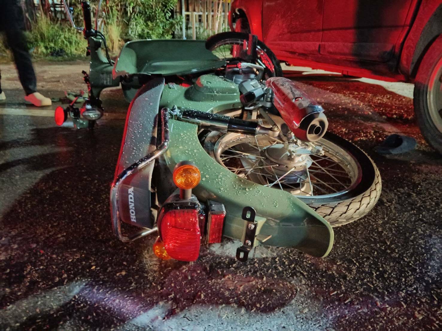 สลด! จยย.หิ้วน้ำมันกลับบ้าน ถูกกระบะเลี้ยวตัดหน้า ชนสนั่นไฟลุกคลอกดับ