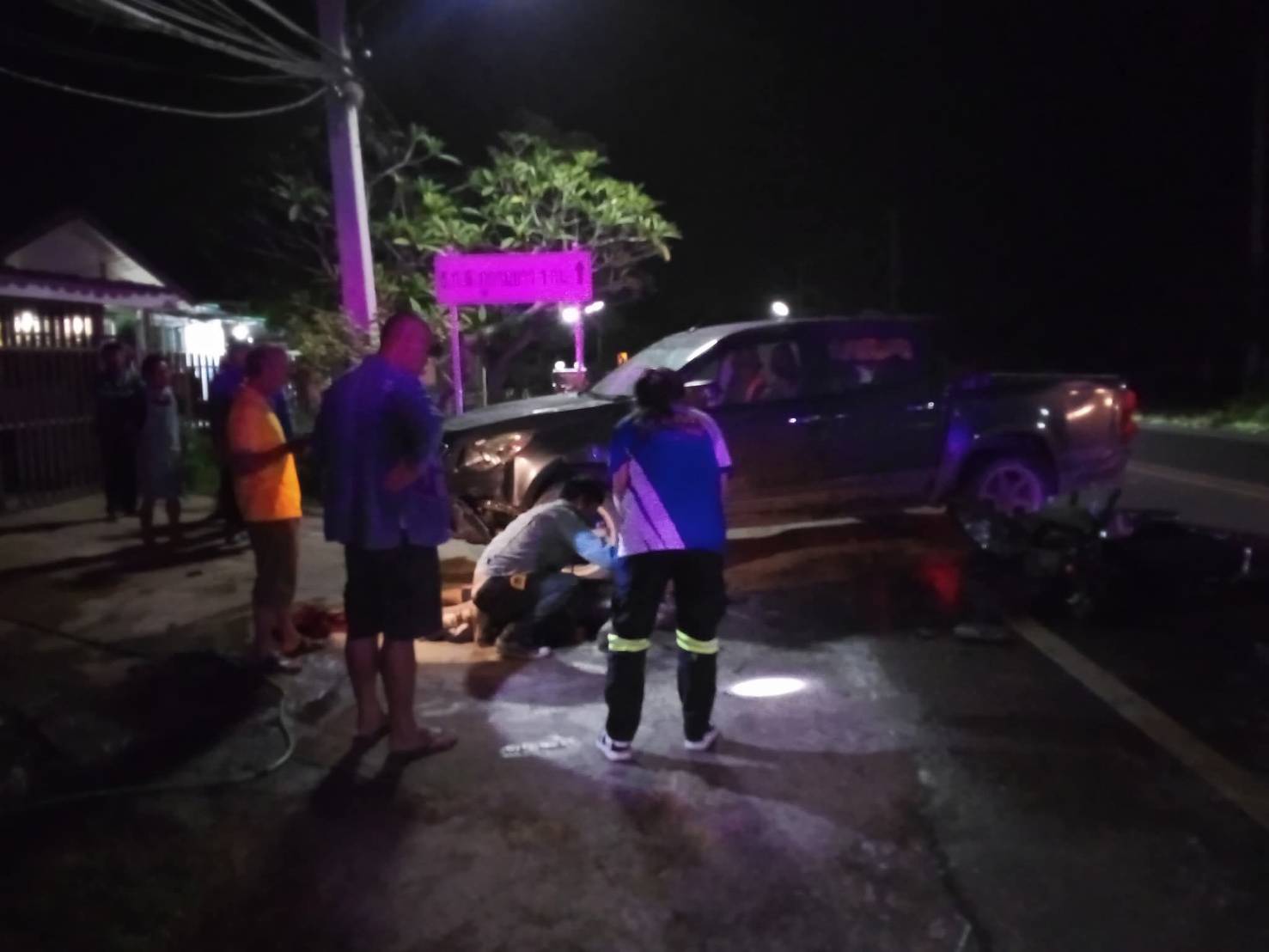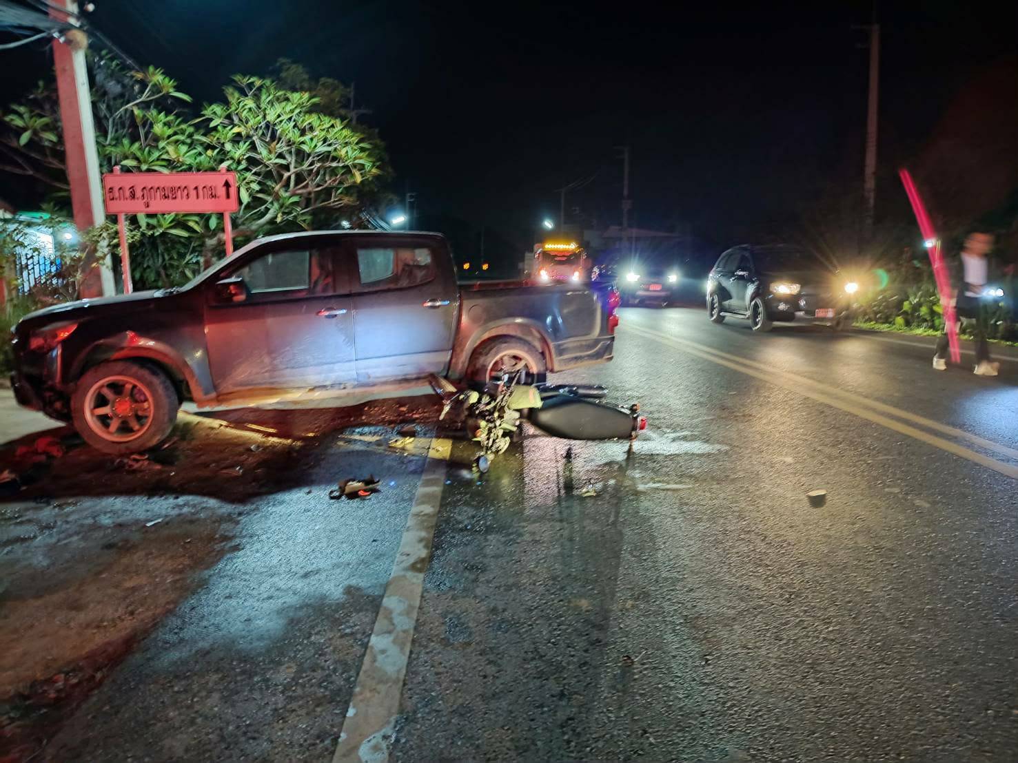 ที่เกิดเหตุพบรถจักรยานยนต์ฮอนด้า สีเขียว ไม่ติดแผ่นป้ายทะเบียน สภาพด้านหน้าพังยับ ล้มตะแคงอยู่ข้างรถกระบะคู่กรณี ยี่ห้อเชฟโรเลต ทะเบียน ขง 9710 อุดรธานี ซึ่งมีรอยชนบริเวณมุมหน้าซ้ายพังเสียหายหนัก พร้อมคราบน้ำมันกระจายเต็มพื้นถนน และพบผู้เสียชีวิตทราบชื่อ ด.ช.ภานิพัฒน์ มิงสอน (สงวนชื่อสกุล) อายุ 13 ปี ชาวบ้านกว้าน หมู่ 1 ต.ดงเจน อ.ภูกามยาว จ.พะเยา กู้ชีพดงเจนให้การช่วยเหลือเร่งด่วน ก่อนส่งต่อรถ EMS รพ.พะเยาและเสียชีวิตในเวลาต่อมา