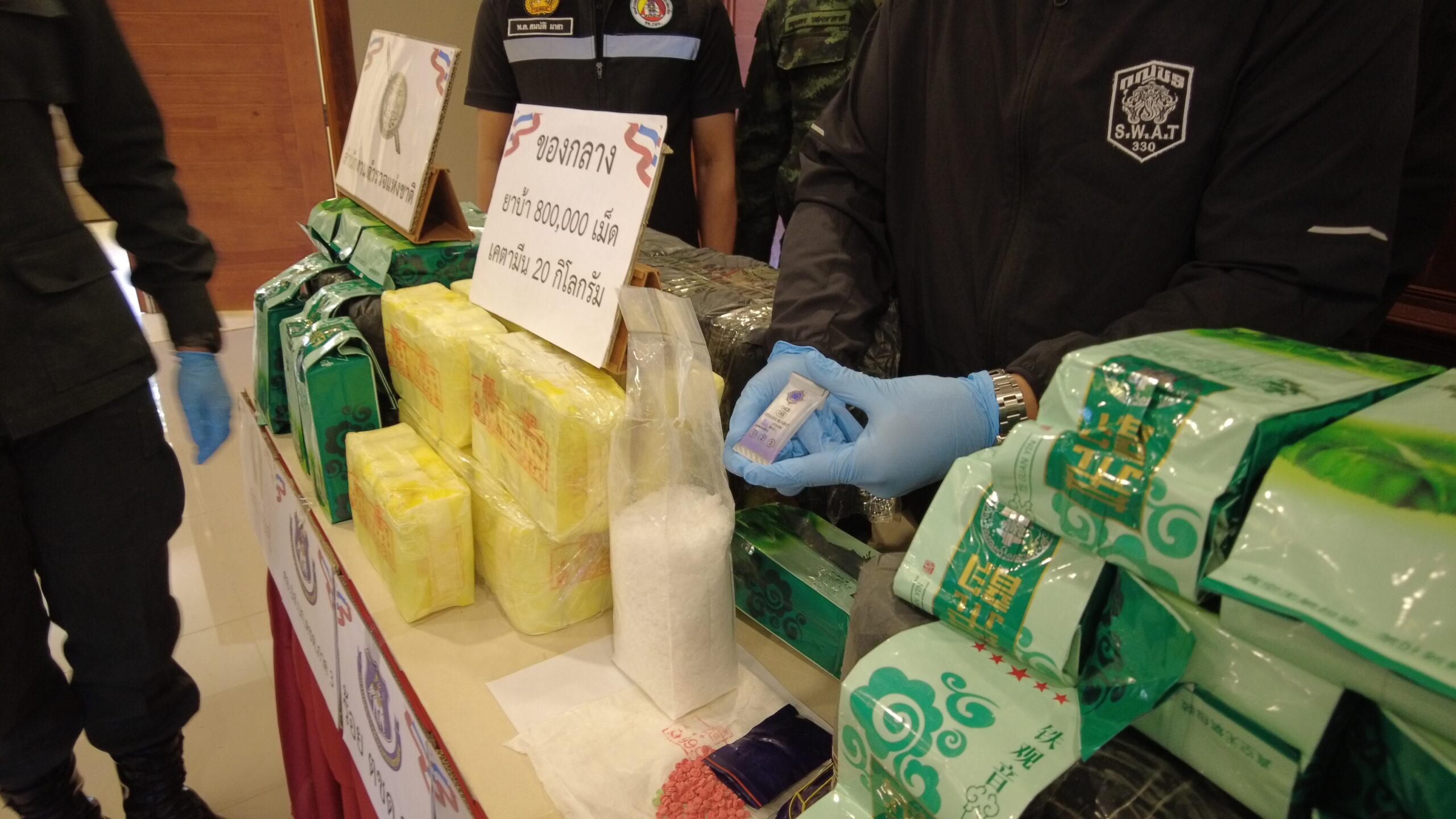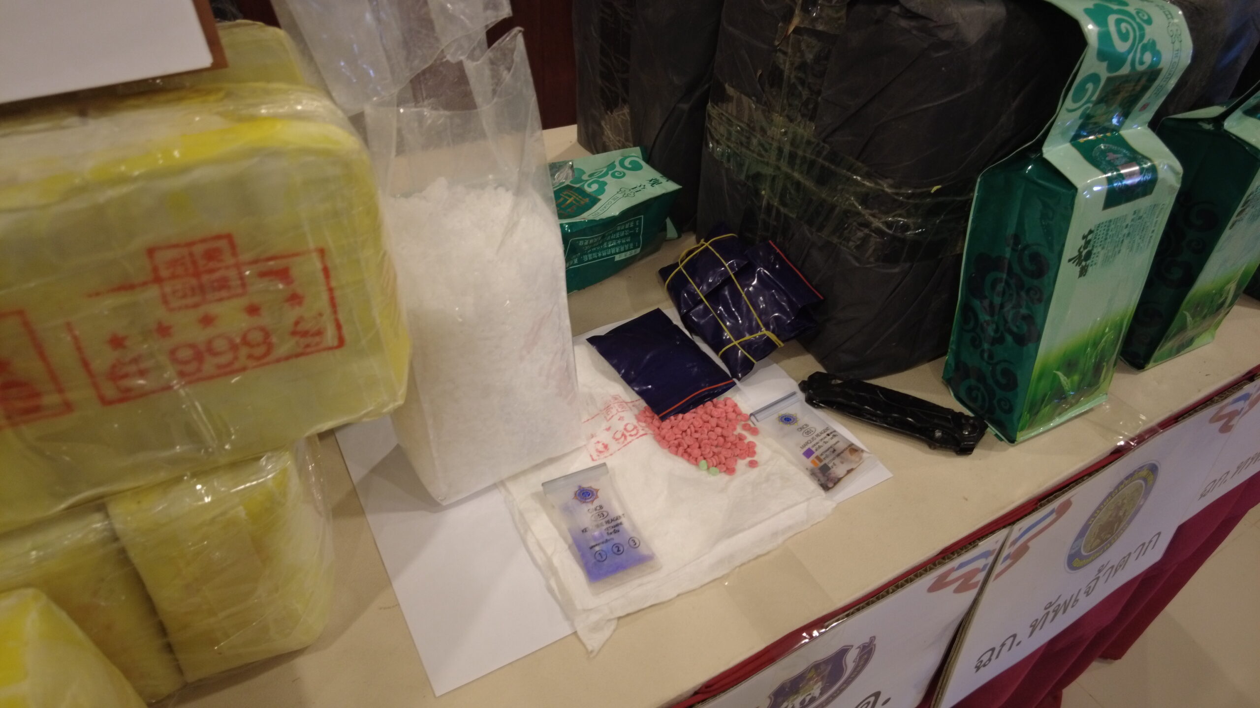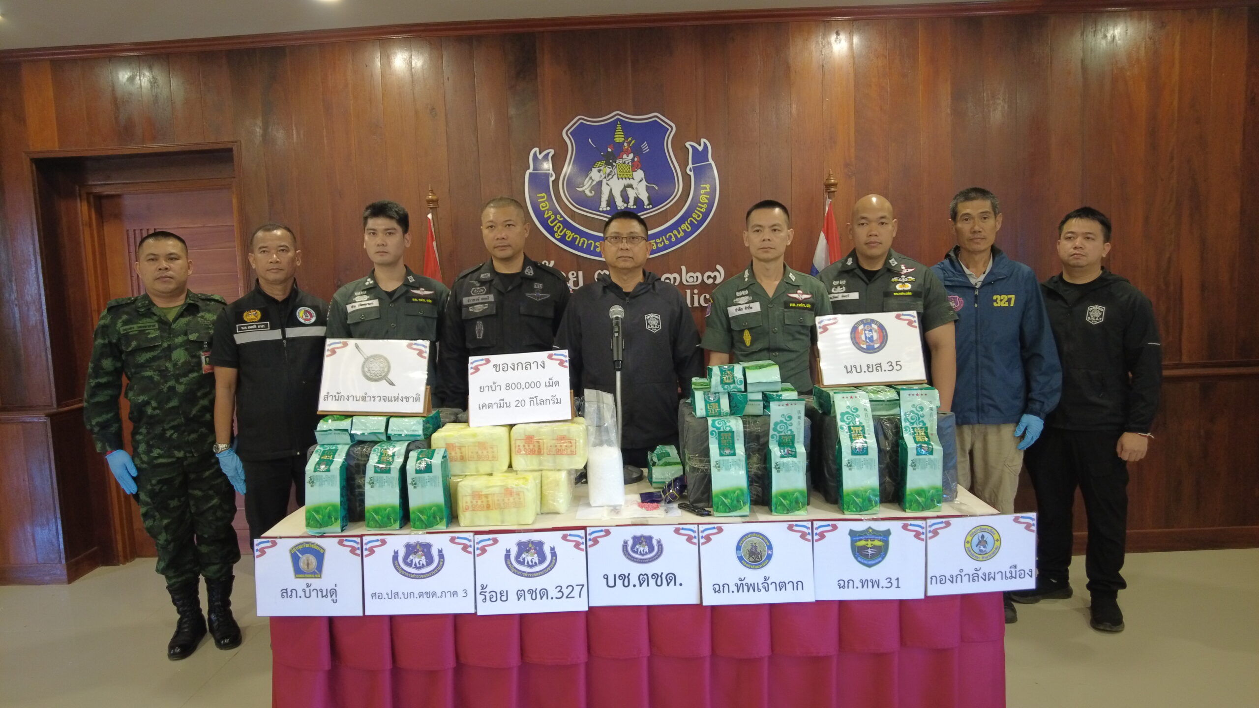 เวลา 11.30 น.วันที่ 15 ม.ค.69 ที่กองร้อยตชด 327 อ.แม่จัน จ.ชียงราย พล.ต.ท.รุ่งโรจน์ ฐากูรปุณยสิริ ผบช.ตชด.มอบให้ พ.ต.อ.รังสิมันต์ สงเคราะห์ รอง ผบก.ตชด.ภาค 3 เป็นประธานการแถลงข่าวร่วมกับ พ.อ. จักรพงษ์ สอดสี ผบ.ทพ.31 กองกำลังผาเมือง พ.ต.ท.ชวลิต คำตื้อ รอง ผกก.หน.ร้อย ตชด.327 เจ้าหน้าที่ตำรวจ สภ.บ้านดู่ พร้อมด้วยหน่วยงานที่เกี่ยวข้อง ได้ร่วมกันแถลงข่าว การตรวจยึดยาบ้าจำนวนประมาณ 800,000 เม็ดและคีตามีนประมาณ 20 กิโลกรัม