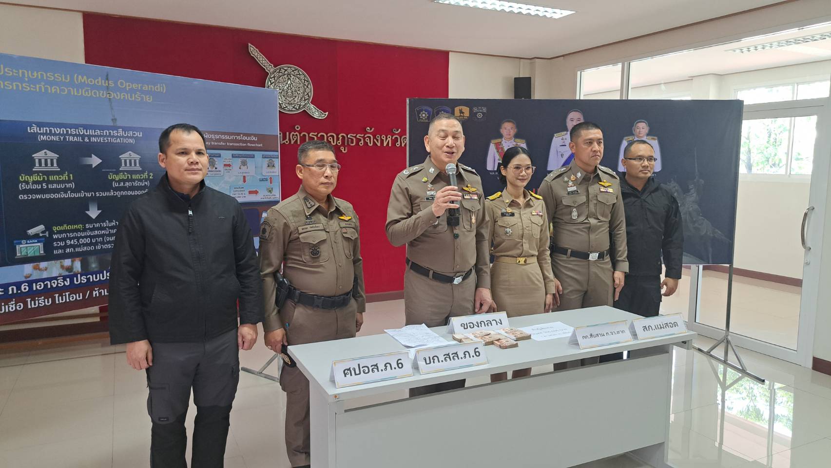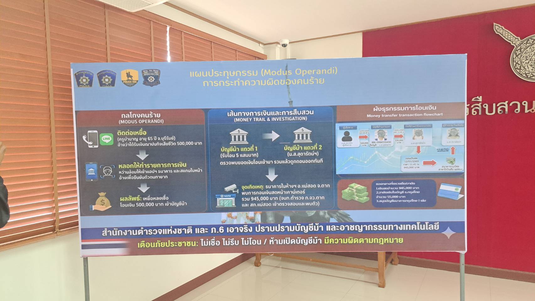อีกทั้งได้ตรวจยึดทรัพย์หรือสิ่งของที่เชื่อว่าเกี่ยวข้องกับการกระทำผิด เป็น 1. เงินสด รวมจำนวน 945,000 บาท 2.สมุดบัญชีธนาคาร 1 เล่ม การจับกุมและตรวจยึดดังกล่าว สืบเนื่องจาก สถานีตำรวจภูธรแคนดง จังหวัดบุรีรัมย์ รับแจ้งความร้องทุกข์จาก นางปราณี มารังรัมย์ (ผู้เสียหาย/ข้าราชการบำนาญ) ว่า เมื่อวันที่ 12 มกราคม 2569 เวลาประมาณ 10.30 น. ถูกคนร้ายหลอกลวงอ้างตนเป็นเจ้าหน้าที่ฌาปนกิจสงเคราะห์สหกรณ์ออมทรัพย์ครูจังหวัดบุรีรัมย์ หลอกลวงให้โอนเงินไปยังกลุ่มคนร้าย โดยแจ้งข้อความอันเป็นเท็จว่าผู้เสียหายจะได้รับเงินสวัสดิการจากรัฐ หากดำเนินการทางธุรกรรมออนไลน์กับกลุ่มคนร้ายโดยติดต่อผ่านแอปพลิเคชั่นโทรศัพท์ชื่อว่า “สหกรณ์ออมทรัพย์ครูบุรีรัมย์” จนผู้เสียหายสับสนและหลงเชื่อ ทำการโอนเงินจากบัญชีธนาคารของตนเอง จำนวน 500,000 บาท เข้าไปยังบัญชีธนาคารกรุงเทพ ชื่อบัญชี “นางสาวสุพิชยา ชารัมย์” ซึ่งต่อมา ธนาคารกรุงไทยได้ตรวจพบความผิดปกติในการโอนเงินดังกล่าวจึงติดต่อสอบสวนผู้เสียหาย ทำให้ทราบว่าถูกกลุ่มคนร้ายหลอกลวงเอาเงินไป
