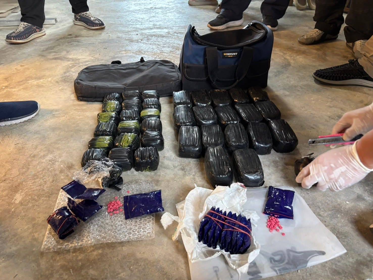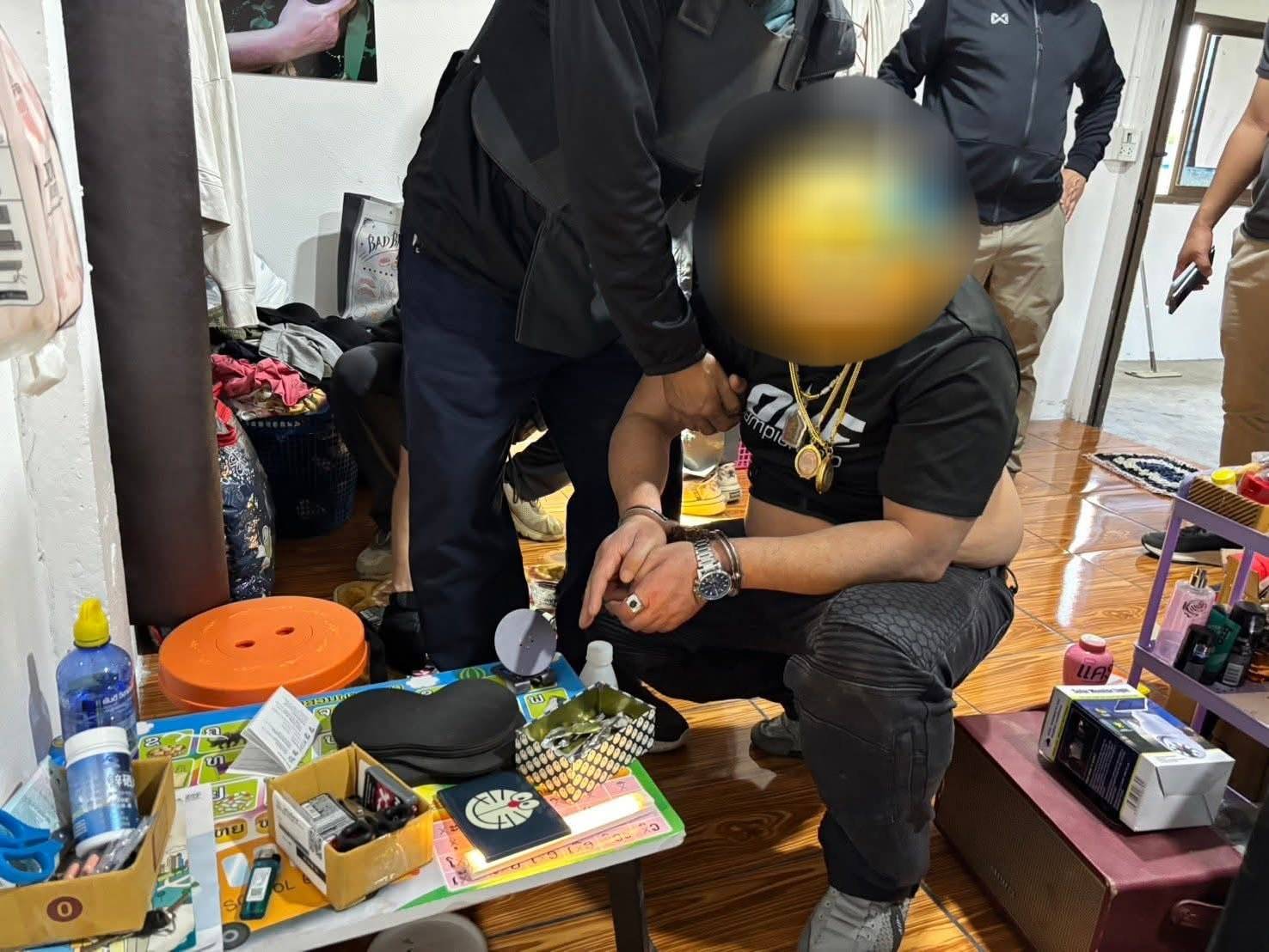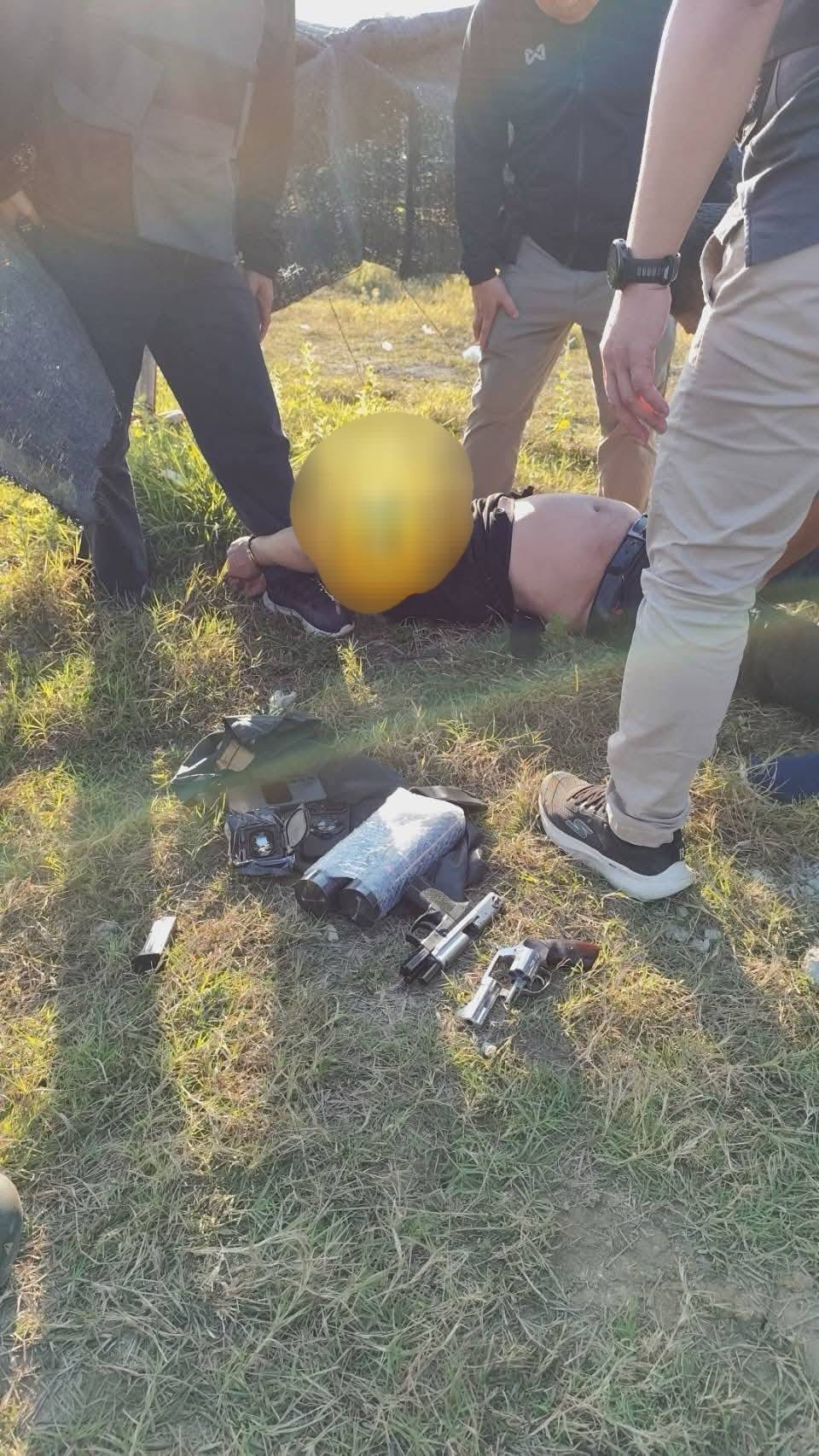 จากการตรวจค้น พบอาวุธปืนกึ่งอัตโนมัติ ซุกซ่อนอยู่บริเวณลำตัวด้านซ้าย และพบอาวุธปืนลูกโม่  ซุกซ่อนอยู่บริเวณเอวด้านขวา  จากนั้นได้เข้าทำการตรวจค้น จนสามมารถตรวจยึดยาบ้าได้อีกจำนวน ประมาณ  59,420 เม็ด ยาไอซ์ 122.1 กรัม  ซุกซ่อนอยู่ภายในที่พัก ทางเจ้าหน้าที่ตำรวจ จึงได้ทำการตรวจยึดของกลางและนำตัวส่งพนักงานสอบสวนดำเนินคดีตามกฎหมายต่อไป