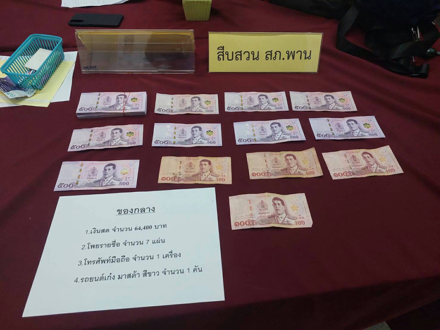 จากการตรวจพบมีนายเจริญ อายุ 65 ปี อดีตสมาชิกสภาท้องถิ่นคนหนึ่งมีภูมิลำเนาอยู่ในเขต อำเภอพาน เมื่อทางเจ้าหน้าที่ตำรวจจะขออนุญาตตรวจค้นภายในรถปรากฎว่านายเจริญ ได้พยายามจะหลบหนีแต่เจ้าหน้าที่ควบคุมตัวเอาไว้ได้ จากนั้นได้ตรวจค้นในรถพบมีธนบัตรใบละ 500 บาทจำนวน 128 ใบ และธนบัตรใบละ 100 บาท จำนวน 4 ใบ รวมเป็นเงินสดทั้งหมดจำนวน 64,400 บาท
