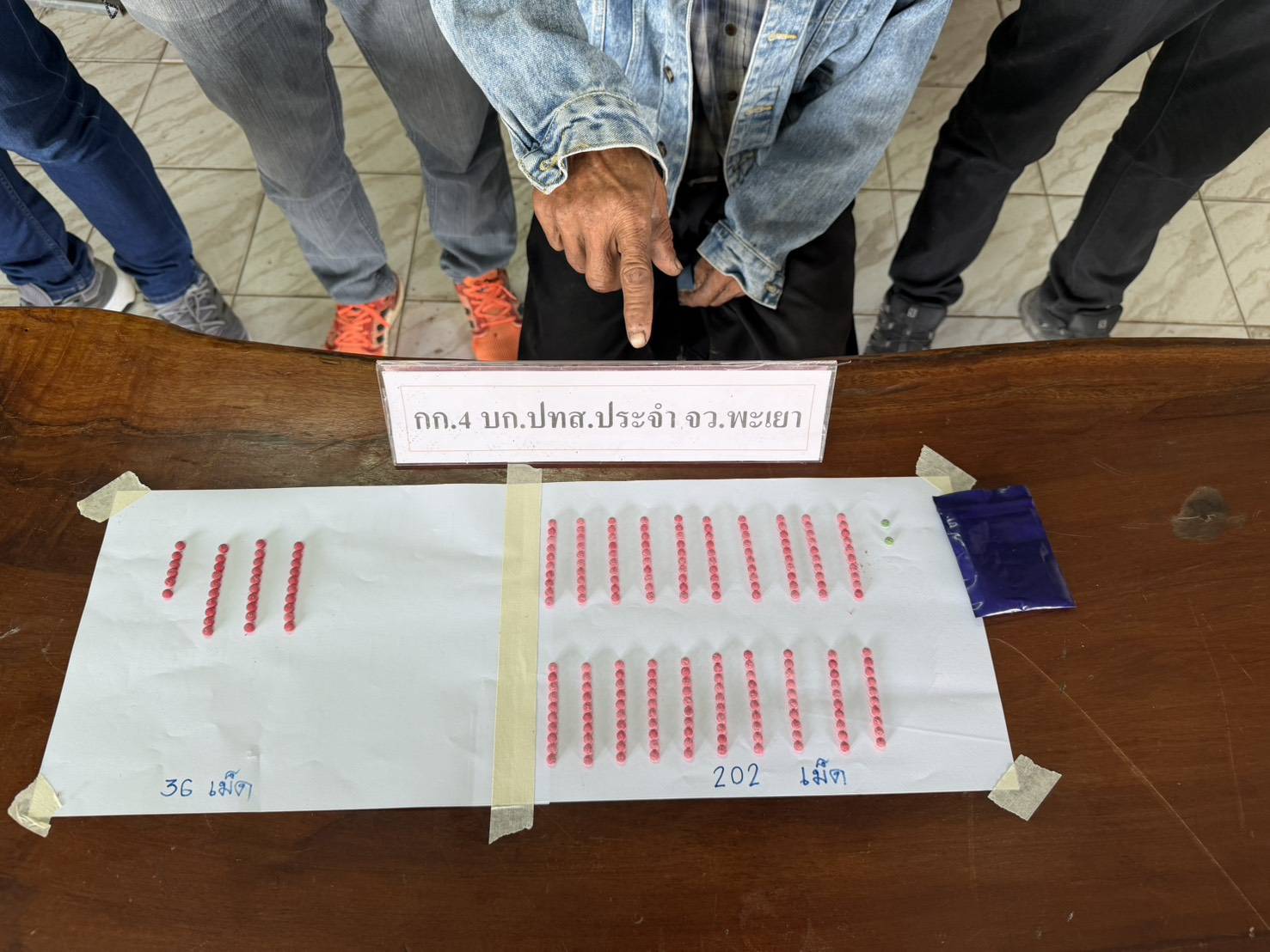 จากการตรวจค้นร่างกายอย่างละเอียด พบยาเสพติดให้โทษประเภท 1 (ยาบ้า) ซุกซ่อนอยู่ที่ตัวของนายยุทแก้ว หรือ ตาเลาจำนวนถึง 238 เม็ด ส่วนนายพิธิวัฒน์ แม้จะไม่พบของกลางในตัว แต่จากการสอบสวนเบื้องต้น ทั้งคู่ยอมรับสารภาพแบบหมดเปลือกว่า เพิ่งเสพยาบ้ามาจริง เจ้าหน้าที่จึงได้ทำการควบคุมตัวทั้งคู่มายัง สภ.จุน เพื่อทำการตรวจปัสสาวะหาสารเสพติด ผลปรากฏว่า เป็นบวก ทั้งสองราย เจ้าหน้าที่จึงได้แจ้งข้อกล่าวหากับนายยุทแก้ว ในข้อหาครอบครองยาเสพติดฯ เพื่อจำหน่ายและเสพยาเสพติด ส่วนนายพิธิวัฒน์ ถูกแจ้งข้อหาเสพยาเสพติดฯ ก่อนนำตัวส่งพนักงานสอบสวนดำเนินคดีตามกฎหมายต่อไป