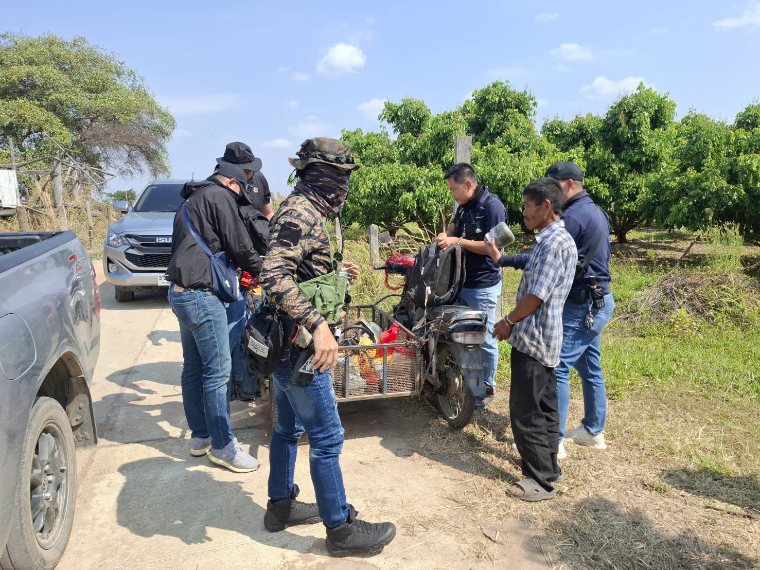 ขณะที่เจ้าหน้าที่ชุดจับกุมเดินทางไปถึงบริเวณถนนทางการเกษตร พื้นที่ ม.5 พบชาย 2 คนท่าทางพิรุธ ทราบชื่อภายหลังคือ นายยุทแก้ว หรือทอน (สงวนนามสกุล) อายุ 66 ปี และ นายพิธิวัฒน์ หรือแดน (สงวนนามสกุล) อายุ 49 ปี