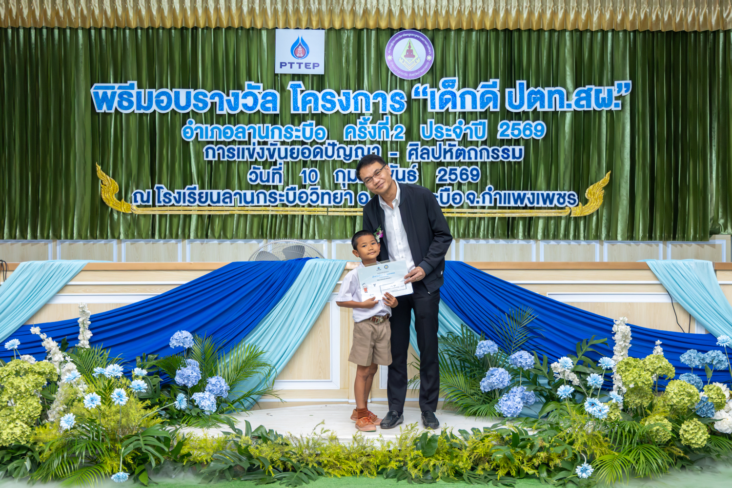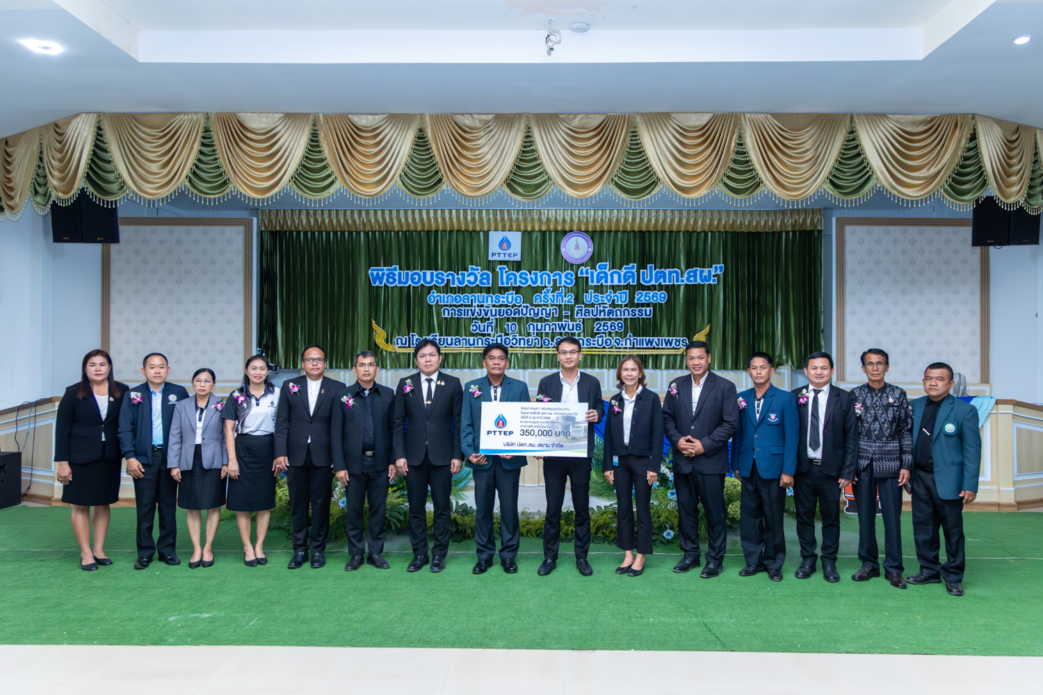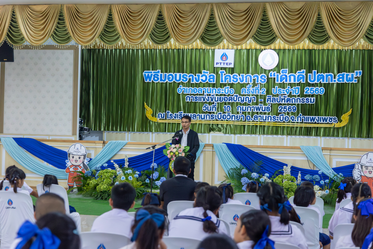วันที่ 10 กุมภาพันธ์ 2569 ปตท.สผ. โครงการเอส 1 ร่วมกับสมาคมผู้ประกอบวิชาชีพครูและบุคลากรทางการศึกษาอำเภอลานกระบือ จัดพิธีมอบรางวัลโครงการ “เด็กดี ปตท.สผ.” อำเภอลานกระบือ ครั้งที่ 2 ประจำปี 2569 การแข่งขันยอดปัญญา – ศิลปหัตถกรรม ณ โรงเรียนลานกระบือวิทยา อำเภอลานกระบือ จังหวัดกำแพงเพชร โดยมี นายศรายุทธ เนียมฤทธิ์ ผู้จัดการอาวุโส ฝ่ายปฏิบัติการผลิต โครงการเอส 1 และนางอิงอร สร้อยสุวรรณ ผู้จัดการองค์กรสัมพันธ์ โครงการเอส 1เป็นผู้แทน ปตท.สผ. เข้าร่วมพิธีมอบรางวัลในครั้งนี้