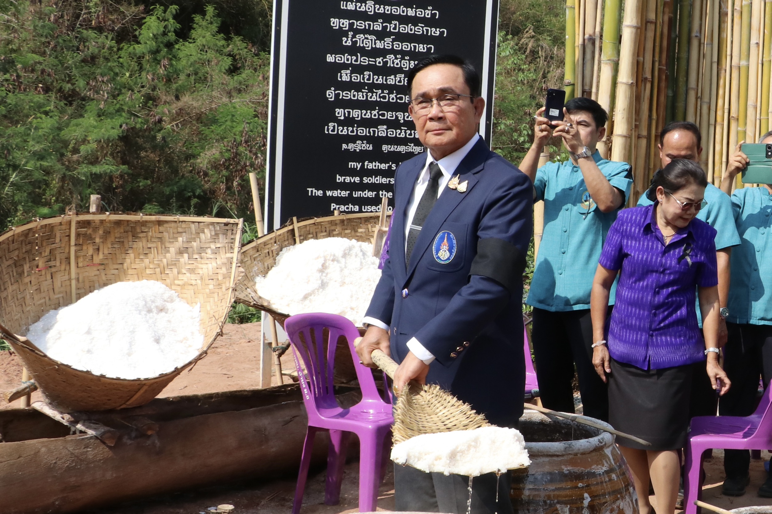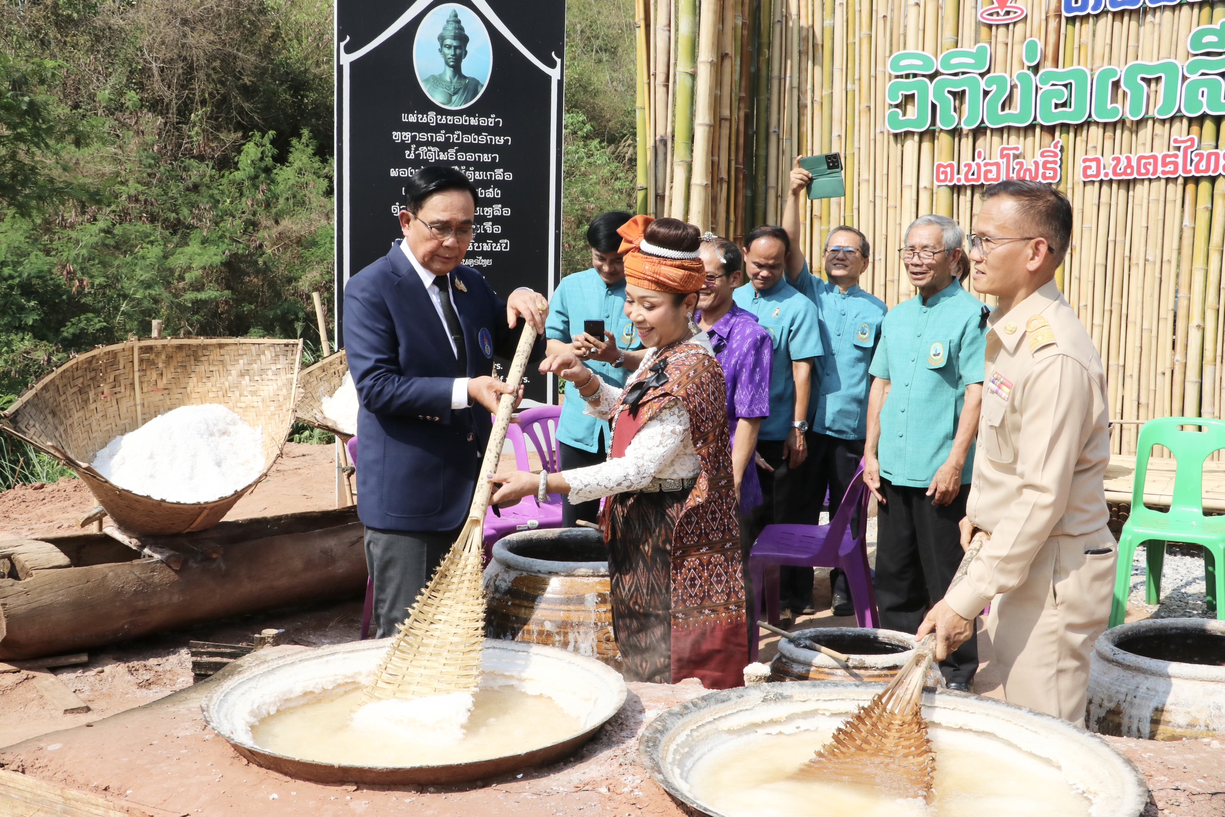 ต่อมาเวลา 14.30 น. พลเอกประยุทธ์ จันทร์โอชา พร้อมคณะเดินทางไปที่บ่อเกลือพันปี ตำบลบ่อโพธิ์ อำเภอนครไทย โดยมีขับเสภา และขบวนแห่ปราสาทผึ้งต้อนรับ โดยองคมนตรี .พร้อมคณะถือดอกไม้นำเข้าบริเวณประตูบ่อเกลือ เข้าสักการะวางดอกไม้ศาลนางเอื้อย นางน้อย และตักน้ำเกลือขึ้นจากบ่อ 3 ถ้ง เทใส่หาบน้ำเกลือนำไปต้ม ชมบูธนิทรรศการ และรับชมการแสดงชุดพิเศษ “เซิ้งบ่อเกลือ” สะท้อนอัตลักษณ์ทางวัฒนธรรม และความอุดมสมบูรณ์ของพื้นถิ่น